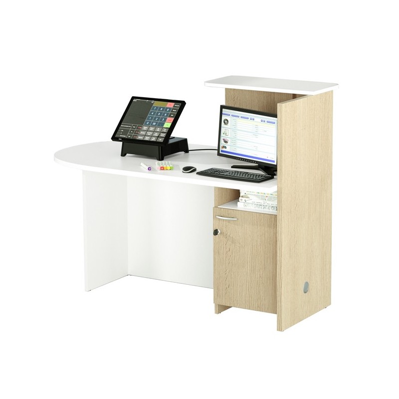 Reception ideale come postazione cassa in negozi, centri estetici ecc. o come reception in ambulatori, cliniche e ovunque sia necessaria una postazione di ricevimento confortevole ma compatta. Dotata di bancone con piano sagomato a SINISTRA 140x83xH73,3cm (sp. 25 mm). Mensola superiore 64x30cm sp. 18mm (H42cm dal piano). Due ripiani L38,2cm sotto il desktop. Fianco (sp. 25mm) con foro passacavi in corrispondenza del ripiano inferiore. Bicolore bianco/rovere.