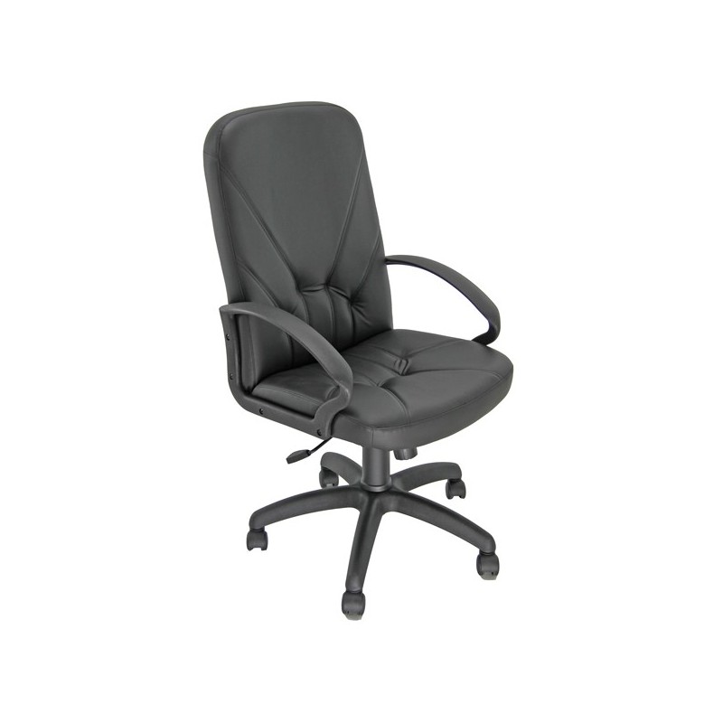 Poltrona in similpelle nera con schienale medio. Braccioli e base con ruote in nylon. Meccanismo oscillante con blocchi. Schienale fisso ed elevazione a gas.