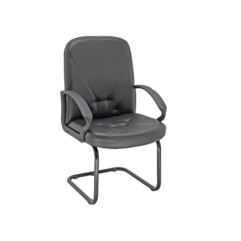 Poltrona in similpelle nera con schienale medio. Braccioli in nylon e slitta in acciaio tubolare. Altezza totale: 97cm Profondità totale: 62 cm Altezza seduta: 45 cm Larghezza sedile: 50 cm Larghezza sedile con braccioli: 57 cm