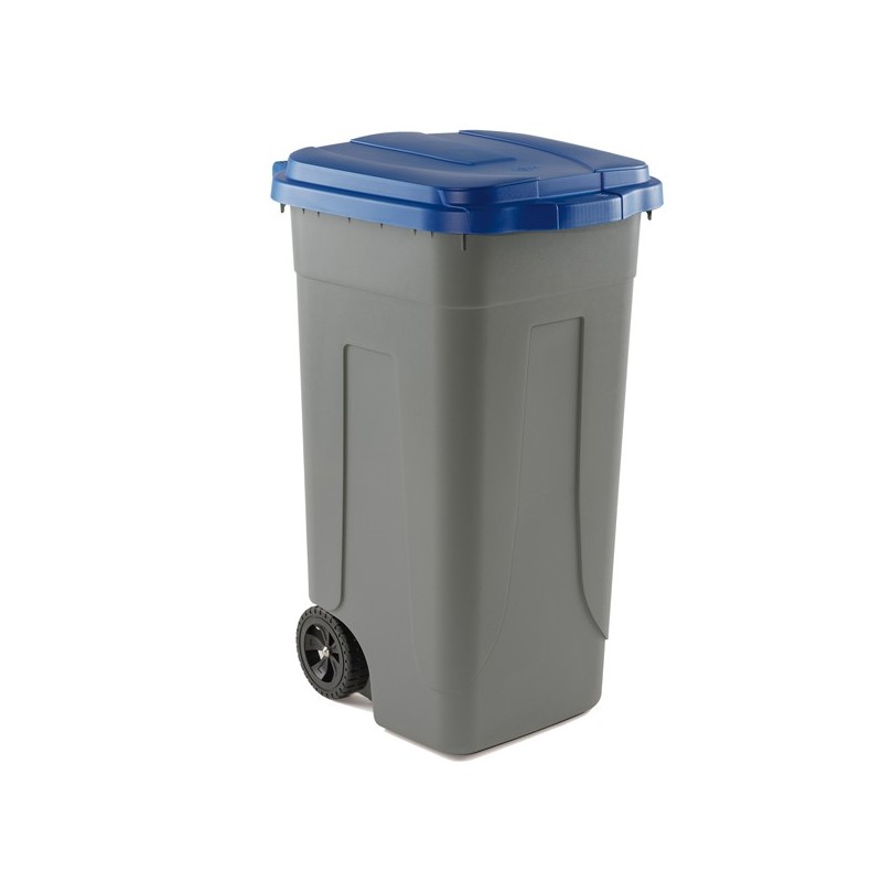 Contenitore da 100 litri per la raccolta differenziata in polipropilene 100% riciclabile. Dotato di ruote incassate antisdrucciolo ad alta scorrevolezza e maniglia ergonomica e rinforzata per facilitarne il trasporto. 4 ganci fermasacco. Coperchio con pratica chiusura a clip. Bidoni facilmente impilabili e con ruote montate. Dimensioni: L49 x P54 x H85cm.