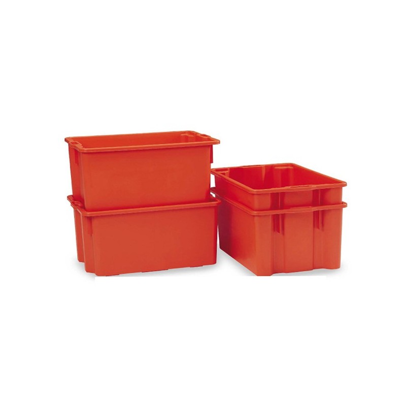 Contenitori a cassa chiusa inseribili fra loro e sovrapponibili. In polietilene ad alta densità (HDPE). Idonei al contatto con alimenti. Colore arancio. Dimensioni: L63 x P44 x H34cm - 65 litri