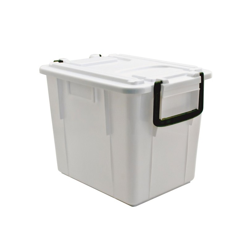 Contenitori food box con coperchio. In polipropilene riciclabile. I contenitori sono sovrapponibili con coperchio e impilabili senza coperchio. Dotati di manici. Idonei al contatto con alimenti. Colore bianco. Dimensioni: L38 x P28 x H30cm - 20 litri