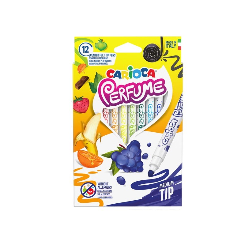 Pennarelli Carioca Perfume, ogni colore ha la sua essenza. Contiene un inchiostro profumato e lavabile. Gli aromi usati sono stati rigorosamente selezionati per richiamare le essenze naturali escludendo tracce di sostanze allergeniche.