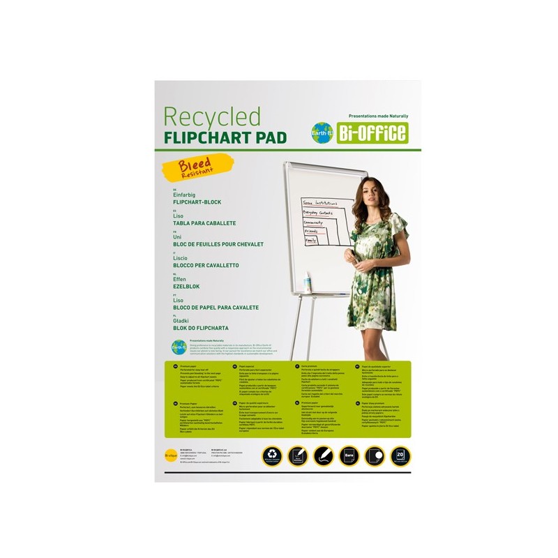 Maxiblocco da 50 fogli 65x98cm in carta riciclata al 100% per lavagne a fogli mobili. Carta bianca da 70gr con foratura a 6 fori standard per adattarsi a tutti i portablocchi.