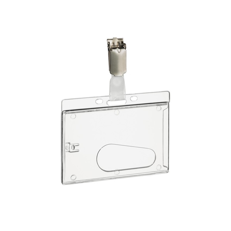 Portabadge in rigido polistirene crystal clear di alta qualità, dotato di asola sulla parte frontale per facilitare la rimozione del badge e di un fermo interno per mantenere in posizione il badge inserito. Fornito di clip in metallo orientabile con protezione interna in plastica salva tessuto.