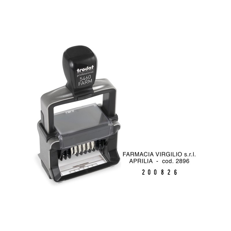 Datario autoinchiostrante per Farmacie, in acciaio Inox. Mascherina di posizionamento per centrare agevolmente le caselline delle ricette mediche. Inchiostro indelebile secondo la normativa DIN ISO 14145-2. Piastra 56x33mm. Altezza data in numeri 4 mm.
