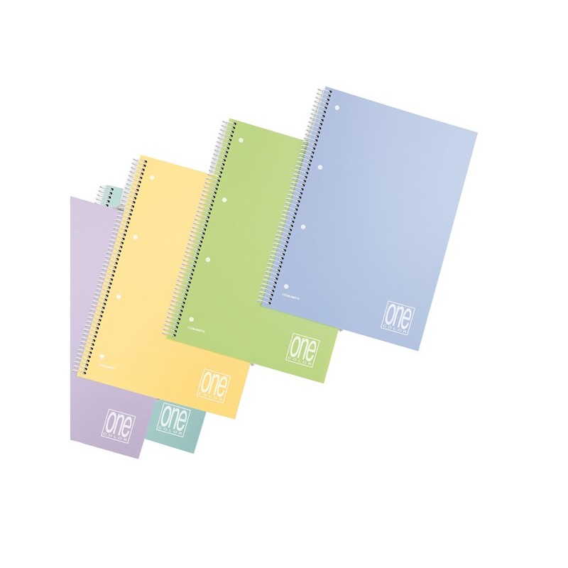 Maxiquaderno spiralato sul lato lungo. Formato 22,2x29,7cm. 80 fogli (160 facciate scrivibili). Forato e microperforato. Carta da 80 gr/mq. Doppia copertina in polipropilene nei colori One Color Pastel. Cartoncino di rinforzo bianco/bianco da 600 gr/mq. Spirale a molla.