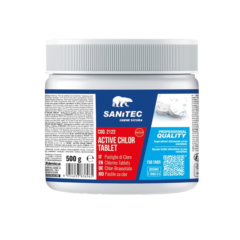 Pastiglie a base di Cloro attivo concentrato, igienizzante, detergente ed elimina odori su tutte le superfici lavabili. Confezione da 500g.