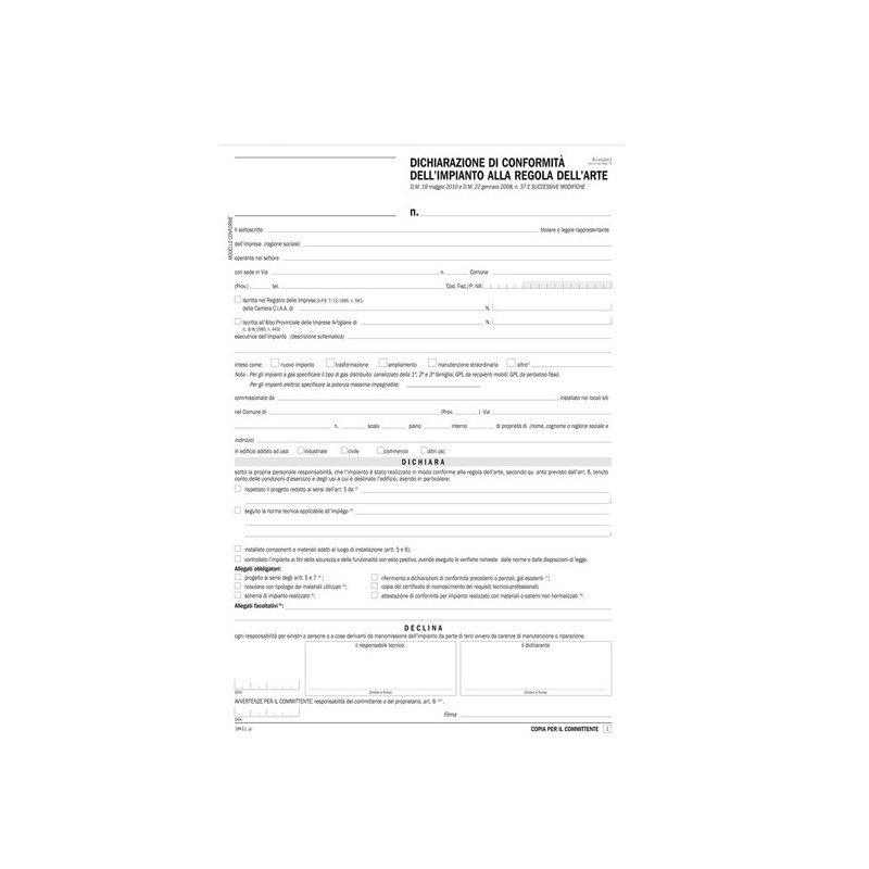 Dichiarazione conformità impianto, 5 copie snap autoricalcanti. Formato 31x21cm.