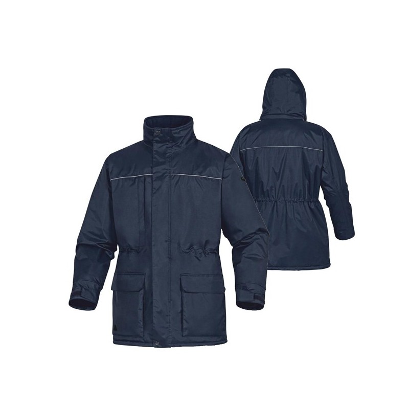 Parka in poliestere rivestito in PVC adatto per freddi estremi (-20°C). Cuciture impermeabili. Chiusura zip anti-freddo sotto baverina stringente a pressione. Vita regolabile tramite elastico. 4 tasche. Fodera in taffetà poliestere foderato.Cappuccio imbottito staccabile. Polsini interni bordo a costa tagliavento. Strisce retro riflettenti decorative davanti e dietro. Porta badge mobile incluso. Certificazione: