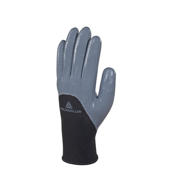 GUANTO IN MAGLIA DI POLIESTERE - SPALMATURA IN NITRILE NEL PALMO DITA E SEMI DORSO. Finezza 13. colore: grigio/nero. Categoria DPI: 2. Certificazione CE. Conformità alle norme EN388:2016 e EN420:2003+A1:2009.