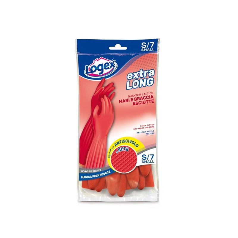 Guanti casalinghi in lattice per tutti i lavori domestici. Colore rosso, interno felpato in cotone, manica frena gocce. Superficie micro-ruvida con una speciale zigrinatura antiscivolo a rete che garantisce una miglior presa su tutte le superfici.La manica extra lunga avvolge il braccio favorendo una migliore impermeabilità ed evita le infiltrazioni di acqua all’interno del guanto.