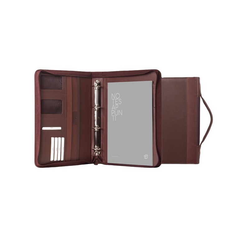 Portablocco in ecopelle a trama rugata. Dotato di meccanismo ad anelli, tasca interna portadocumenti e scomparti per biglietti. Completo di blocco 75ff. Chiusura con zip e manico a scomparsa.