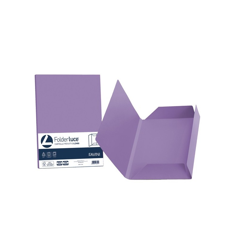 Cartellina a tre lembi in cartoncino bristol da 200gr liscio su ambo i lati. Il fondo dei tre lati presenta lembi fustellati e ripiegati. Formato 245x345mm.