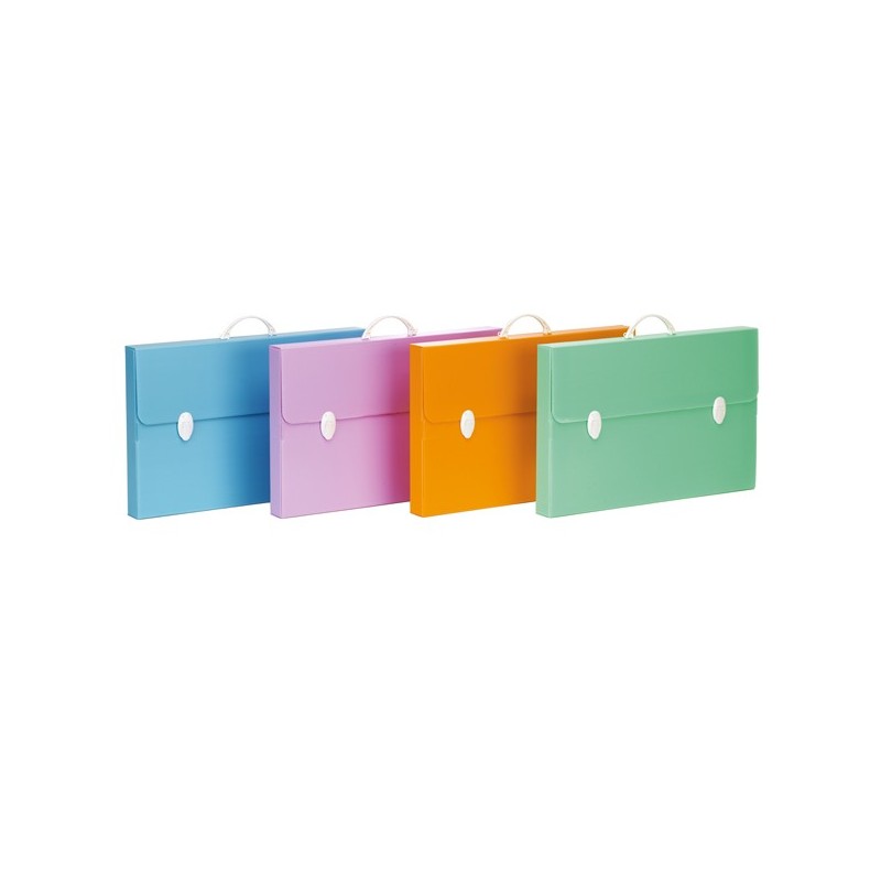 Valigetta in polipropilene alveolare colori pastello assortiti (azzurro, verde, arancio e rosa). Maniglia e chiusure in bianco.