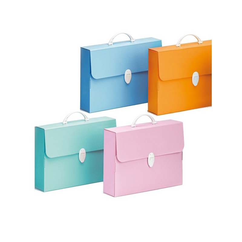 Valigetta in polipropilene alveolare colori pastello assortiti (azzurro, verde, arancio e rosa). Maniglia e chiusure in bianco.