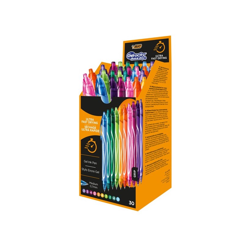 Box 30 penne in 10 colori assortiti con inchiostro gel con punta media da 0,7mm. L'inchiostro, super fluido e scorrevole, si asciuga 3 volte più velocemente per evitare sbavature sul foglio. Fusto nel colore dell'inchiostro, totalmente gommato per un maggior comfort di scrittura.