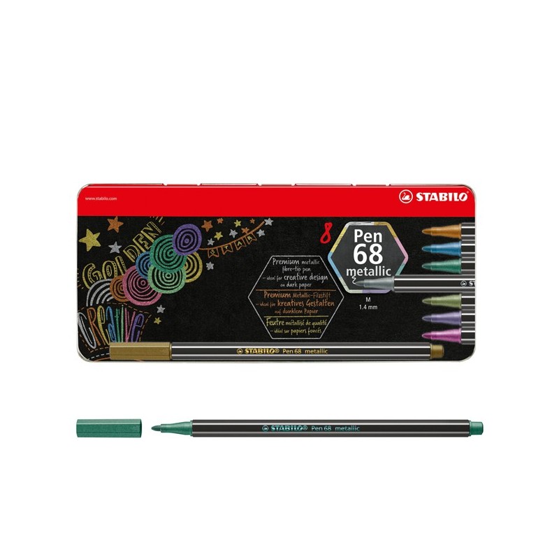 Scatola in metallo contenente 8 pennarelli dai colori metallizzati: argento x2, oro, bronzo, verde, blu, verde chiaro, rosa e lilla. Grande resa sulle superfici lisce come cartoncino, carta, carta scura e metallo grazie all'eccellente copertura.