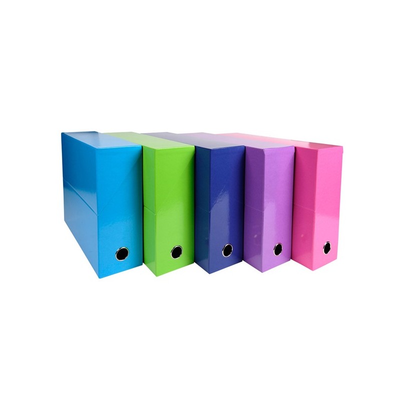 Scatole progetto in carta lustré plastificate per una migliore resistenza. Disponibili in 5 colori assortiti. Occhiello per facilitare la presa. Formato 25x33cm.