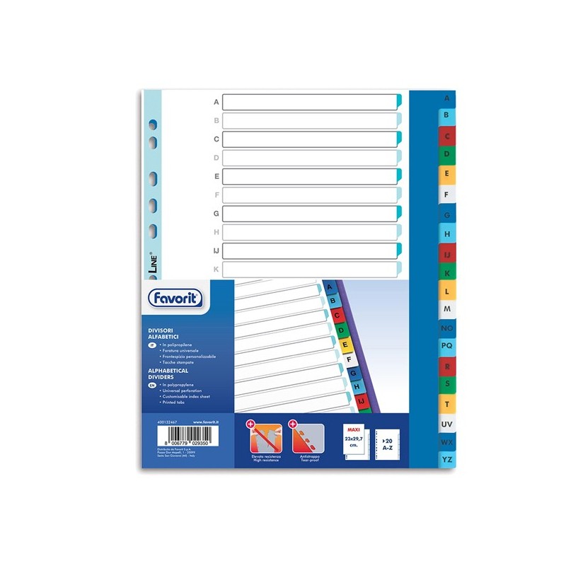 Divisori realizzati in polipropilene da 120my per un uso intensivo. Foratura universale. Frontespizio scrivibile. 20 tacche alfabetiche colorate. Formato A4maxi (23x29,7cm) Made in Germany
