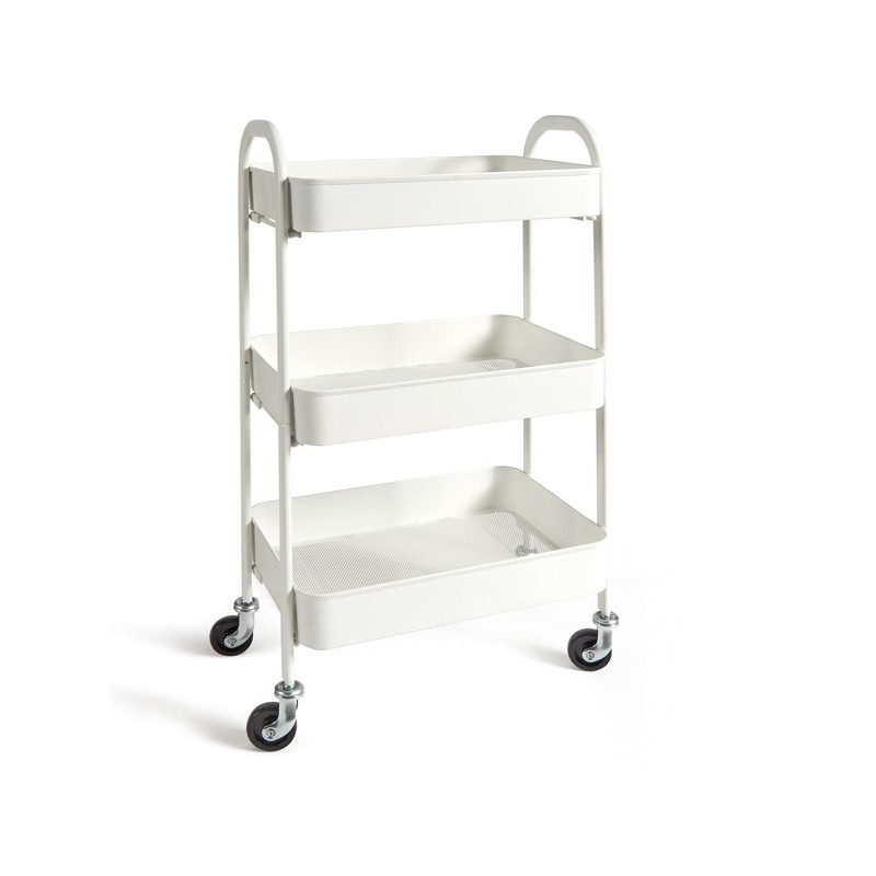 Carrellino in metallo verniciato bianco con 4 ruote girevoli e 3 ripiani. Ideali in cucina, bagno, lavanderia ecc. Si assembla velocemente senza bisogno di attrezzi. Dimensioni: L43 x P30 x H80cm.