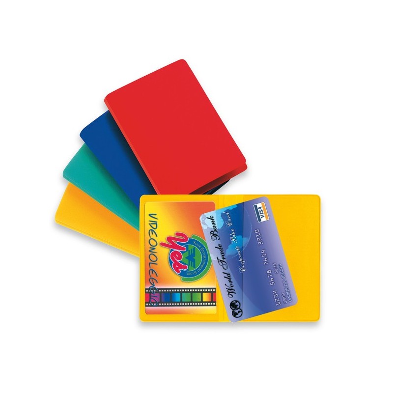 Espositore con porta carte di credito, schede telefoniche, tesserini di riconoscimento, nuovepatenti,viacard,tessere ACI, etc. In PVC morbido colorato.