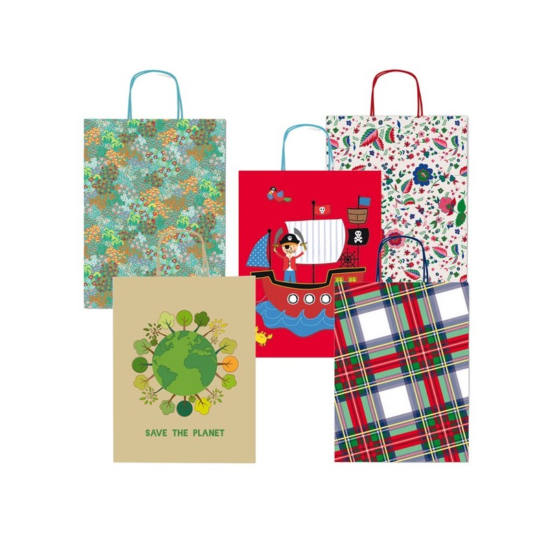 Shopper regalo realizzato in carta kraft bianco con stampe a colori. Dotato di manici in carta ritorta. Assortimento di 5 differente fantasie.