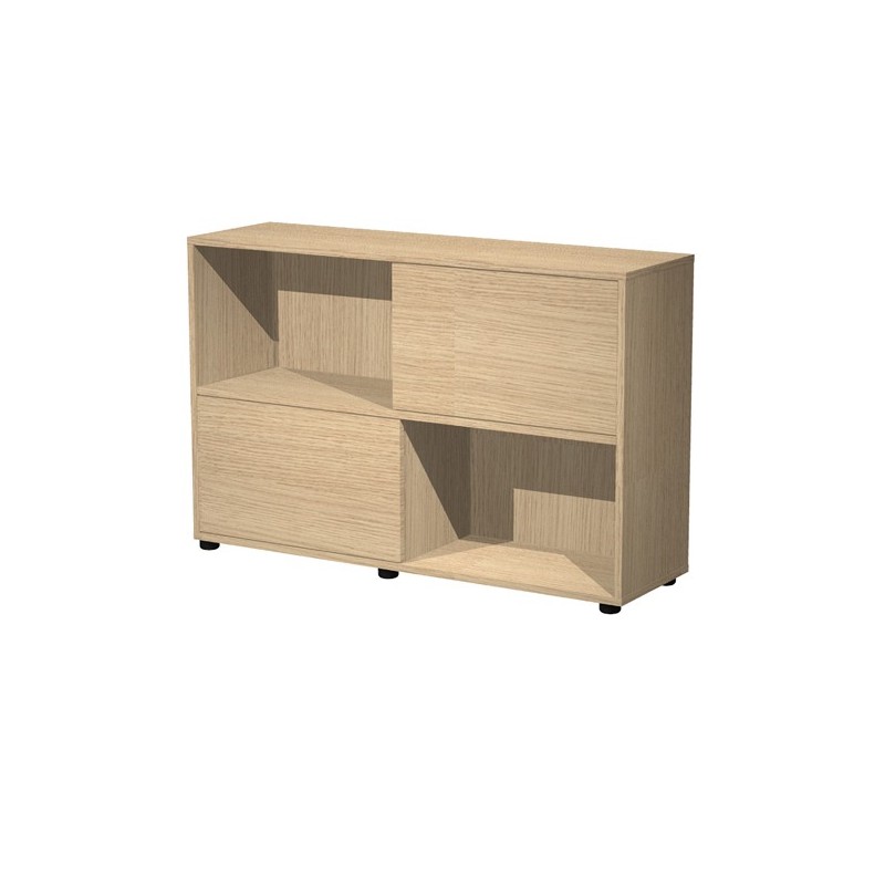 Libreria bassa a 2 ripiani con 2 ante scorrevoli. Struttura e ante in truciolare nobilitato melaminico antigraffio ed antiriflesso spessore 18 mm. Piedini regolabili.