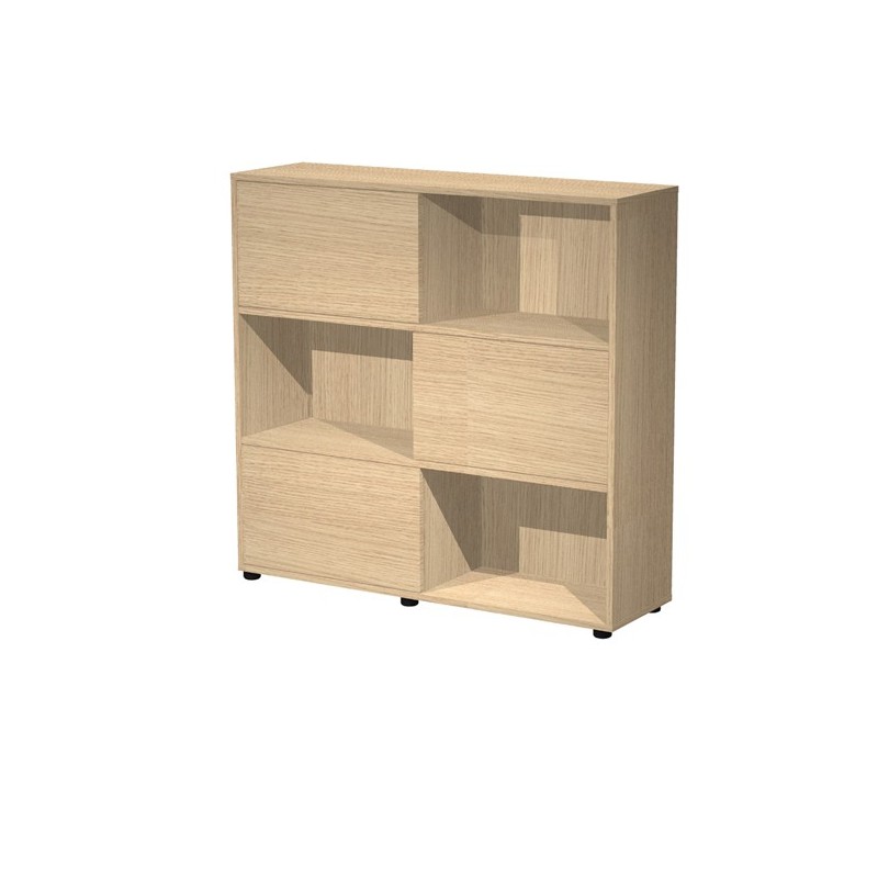 Libreria bassa a 3 ripiani con 3 ante scorrevoli. Struttura e ante in truciolare nobilitato melaminico antigraffio ed antiriflesso spessore 18 mm. Piedini regolabili.