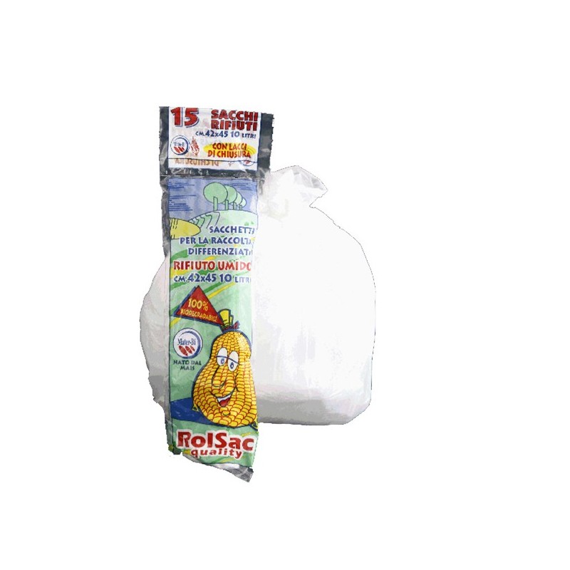 Sacchi pattumiera di colore bianco in BIOPOLIMERO BIODEGRABILE. Formato 42x45cm 10Lt 17µ con lacci di chiusura. In rotolo da 15 sacchi. Prodotto con alta resistenza meccanica adatti alla raccolta della frazione umida.