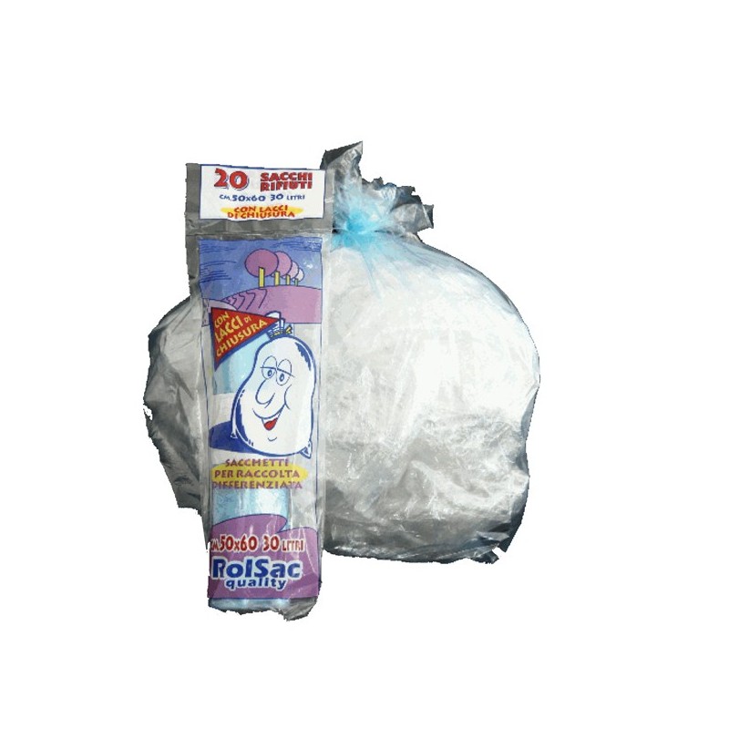 Sacchi pattumiera di colore azzurro trasparente in MDPE rigenerato + PLT lineare. Formato 50x60cm 30Lt 16µ con lacci di chiusura. In rotolo da 20 sacchi. Prodotto con alta resistenza meccanica. Adatti per la raccolta differenziata.