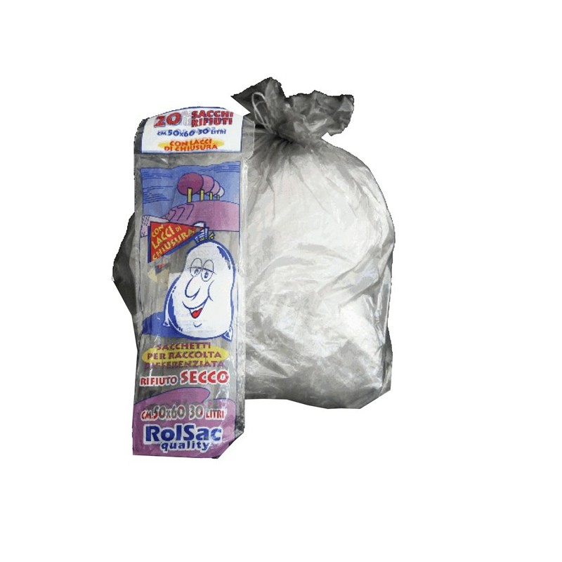 Sacchi pattumiera di colore grigio trasparente in MDPE rigenerato + PLT lineare. Formato 50x60cm 30Lt 16µ con lacci di chiusura. In rotolo da 20 sacchi. Prodotto con alta resistenza meccanica. Adatti per la raccolta differenziata.
