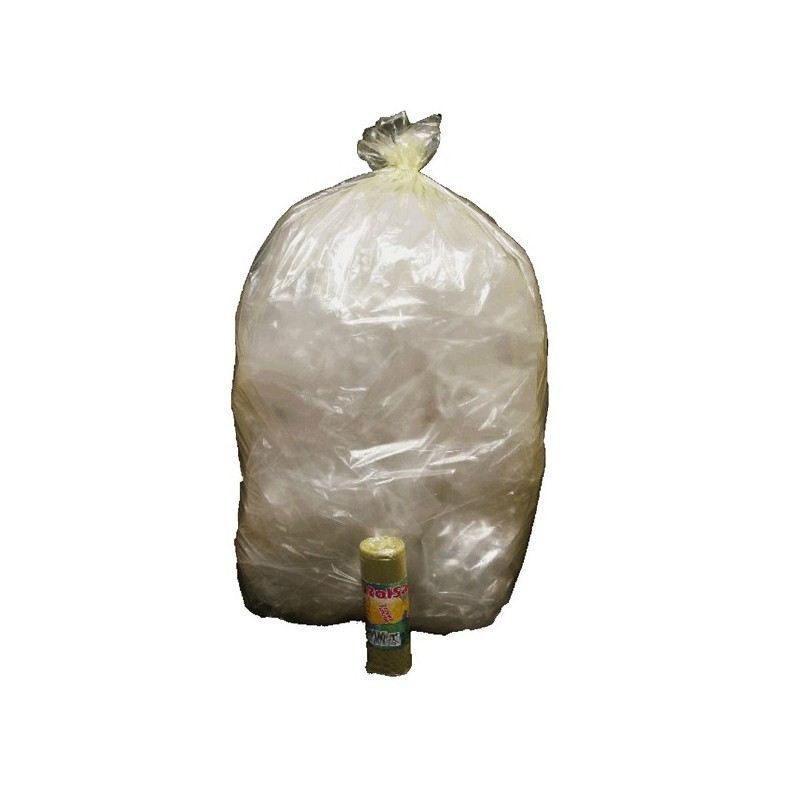 Sacchi pattumiera di colore giallo trasparente in MDPE rigenerato + PLT lineare. Formato 70x110cm 110Lt 22µ. In rotolo compatto da 10 sacchi con fascetta. Prodotto con alta resistenza meccanica. Adatti per la raccolta differenziata.