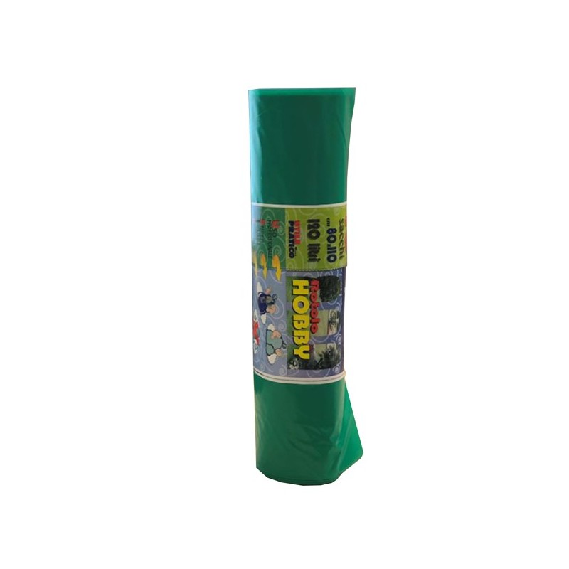 Sacchi pattumiera di colore verde in MDPE rigenerato + PLT lineare. Formato 80x110cm 130Lt 46µ con fondo piatto. In rotolo compatto da 10 sacchi con fascetta. Prodotto con alta resistenza meccanica. Adatti per hobbistica, giardinaggio ecc.
