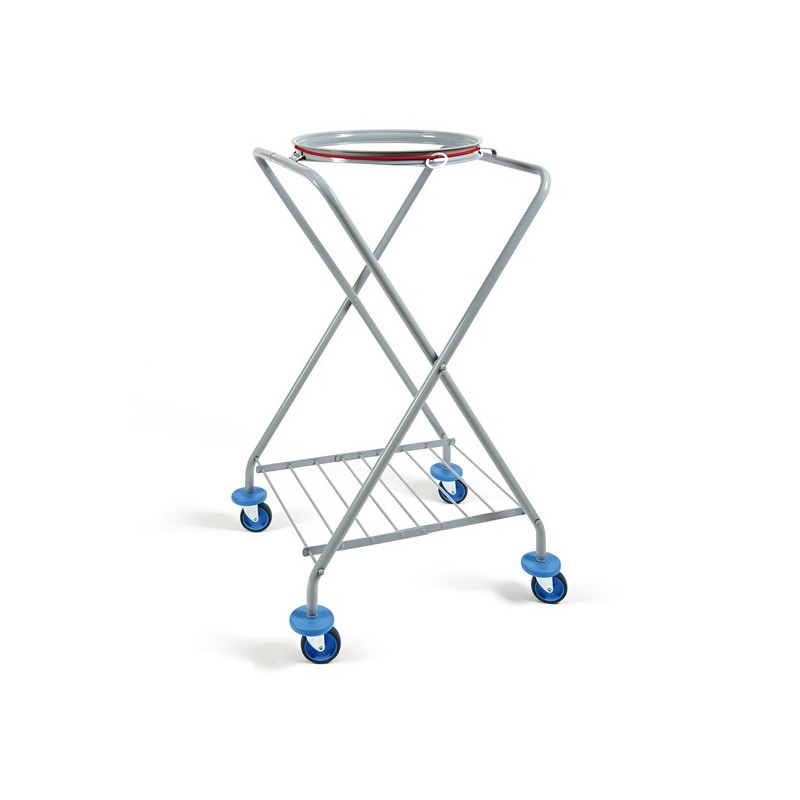 Carrello pieghevole dotato di pratico elastico ferma sacco. Struttura in ferro e polipropilene con 4 ruote pivottanti. Dimensioni: L58 x P56cm x H106cm.