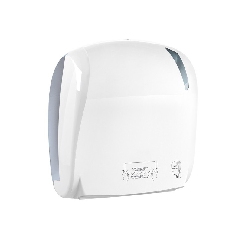 Dispenser a taglio automatico per carta asciugamani in rotolo autocut. La carta viene tagliata automaticamente dal dispenser. Il meccanismo non ha nessun dispositivo elettrico. Ad ogni strappo il dispenser eroga un lembo di carta di circa 27 cm. Cover in ABS, utilizzo gradevole e silenzioso. Fornito con viti e tasselli per fissaggio a muro. Dimensioni: L33 x P22,1 x H 37,1cm - per rotoli Ø max 20cm.