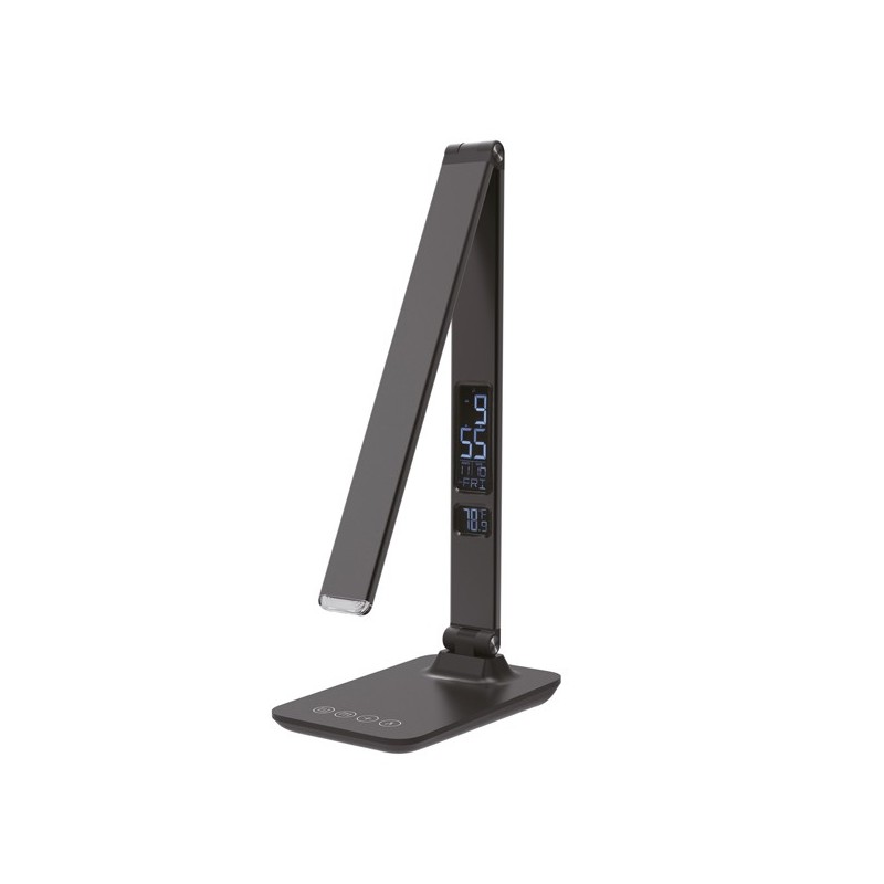 Lampada a LED integrato 10W con testa e braccio inclinabili in alluminio e ABS. Porta USB per ricaricare i tuoi supporti. Display LCD con funzione calendario e termometro. Intensità della luce in 3 colori bianco, giallo e naturale. Interruttore On/Off posizionato sul retro della lampada.