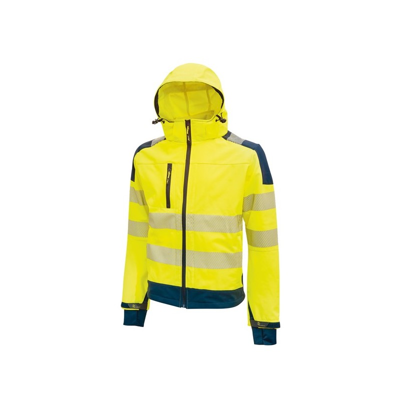 Giacca in tessuto Softshell, stretch, traspirante, antivento e idrorepellente. Due ampie tasche frontali chiuse con zip. Tasca porta cellulare su petto con chiusura zip, cappuccio staccabile con zip, maniche preformate , coulisse antimpigliamento regolabile all’interno della tasca, polsini regolabili con velcro e polsini antivento elasticizzato con buco per il pollice. Fondo sagomato. Strisce riflettenti termo-applicate su busto e braccia zip YKK. Conformità alle norme EN ISO 13688:2013 e EN ISO 20471:2013 + A1:2016.