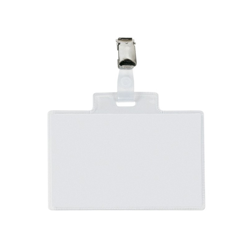 Porta nomi in PVC trasparente, alto spessore, completi di pinzette in metallo e cartoncini. Adatti a congressi, riunioni, visite guidate. Il cartoncino si inserisce dal lato corto. Formato 110x70mm.