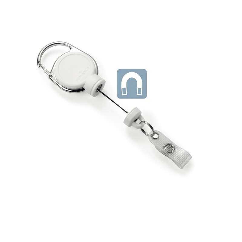 Chiocciola YO-YO per portabadge pesanti o chiavi. La chiusura magnetica supporta un peso fino a 300gr. Dotata di aggangio in metallo e di fascetta di aggancio con bottone a pressione, ancorata ad un piccolo anello in metallo. Cavo retrattile da 60cm. Il magnete integrato può compromettere la lettura delle tessere con banda magnetica.