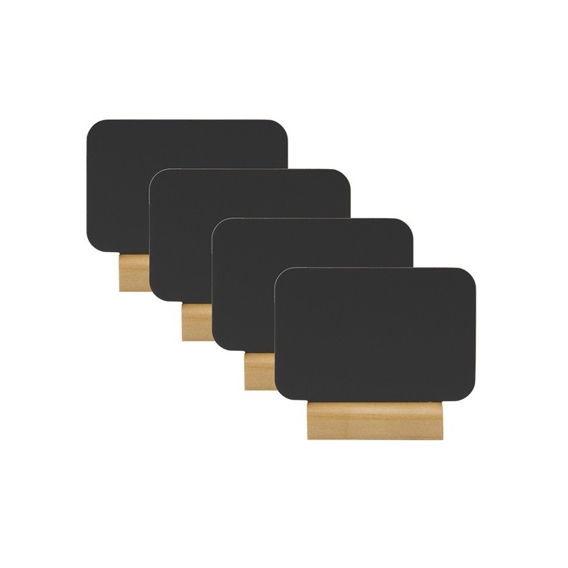 Mini lavagnetta con base in legno, puo' essere usata come segnaposto, per numerare i tavoli o semplicemente per lasciare messaggi flash. Scrivibile su entrambi i lati con base in legno duro. Fornito con 1 pennarello a gesso liquido bianco. Set da 4 lavagnette 7,5x9cm.