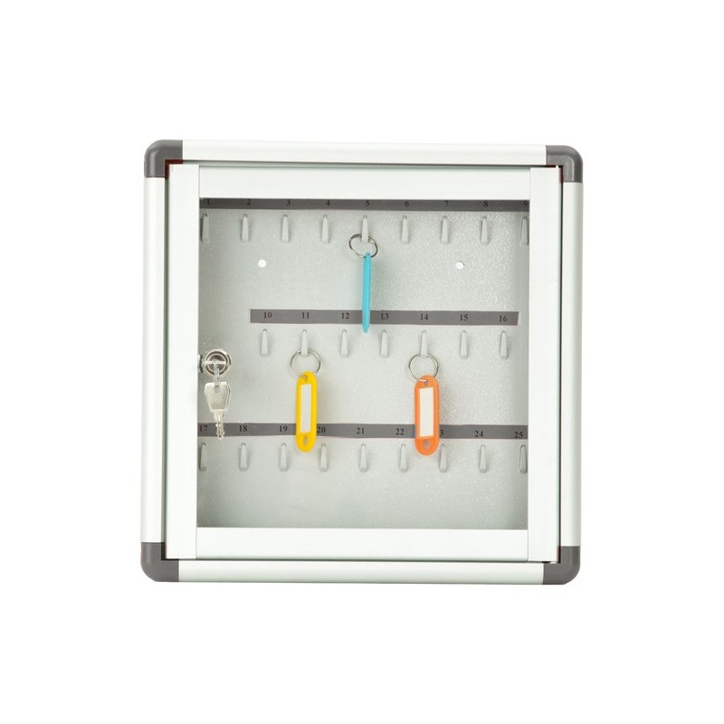 BACHECA MURALE CON PANNELLO IN ACCIAIO LACCATO E GANCI NUMERATI. STRUTTURA IN ALLUMINIO ANODIZZATO. ANTA BATTENTE IN ACRILICO CON SERRATURA. Le file dei ganci distano fra loro (sopra e sotto) di 6,3cm. DIMENSIONI (BXH): 30X30CM - 25 POSTI CHIAVE
