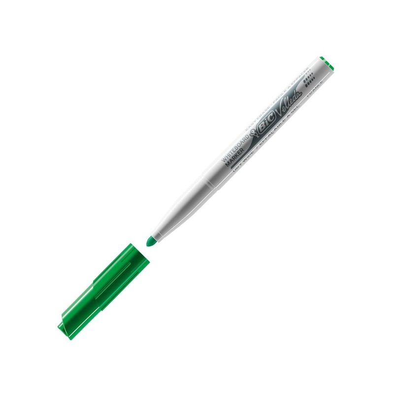 Pennarello per lavagne cancellabili. Inchiostro a base di chetone. Si cancella perfettamente senza lasciare segni. Cappuccio del colore dell’inchiostro con blocco di sicurezza. Fusto in plastica. Punta 1,4mm. Colore: verde.