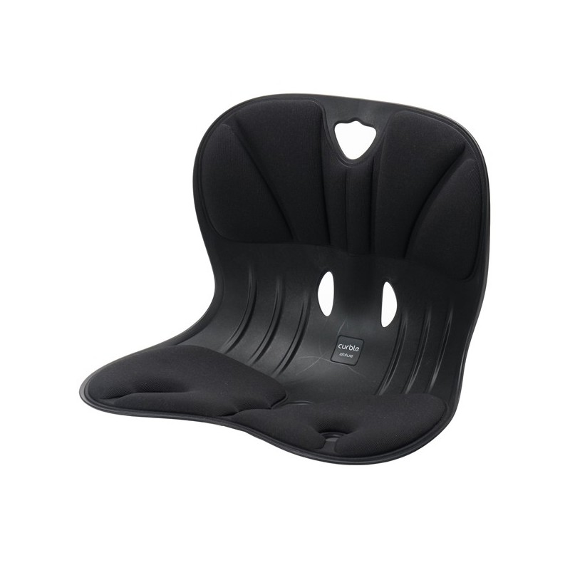 Seduta ergonomica Curble Wider color nera; ideale per tutti coloro che trascorrono gran parte del loro tempo seduti ad una scrivania o davanti ad uno schermo. Grazie all'effetto spinta sarà possibile avere in maniera naturale una postura corretta, garantendo così benessere e sollievo alla persona che la utilizza. Seduta adatta per tutte le età in grado di supportare il peso di una persona fino a 364 kg. Adattabile su qualsiasi sedia, poltrona, divano, letto. Struttura rigida in plastica resinata e cuscino in memory traspirante. Dimensioni: 38x31,5x31,6 cm