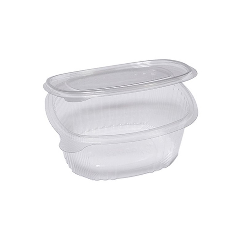 Contenitori ovali in PET con coperchio incernierato. Ideali per cibi freddi, con conservazione in frigo e freezer.