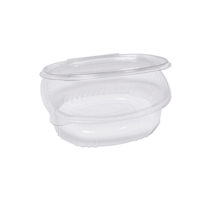 Contenitori ovali in PET con coperchio incernierato. Ideali per cibi freddi, con conservazione in frigo e freezer.