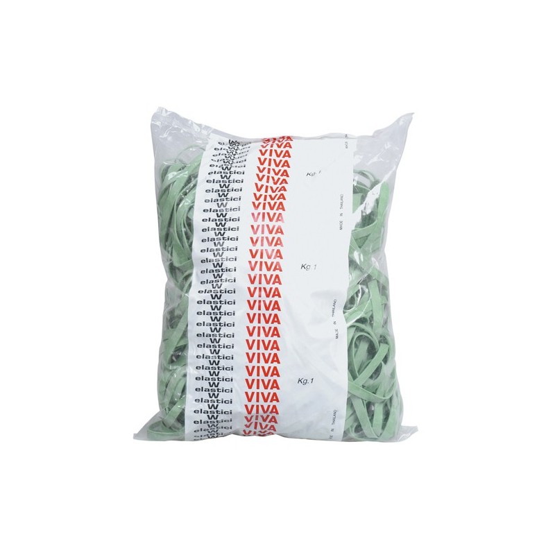 Sacchetto da 1kg di elastici in gomma verde a fettuccia larga 8mm.