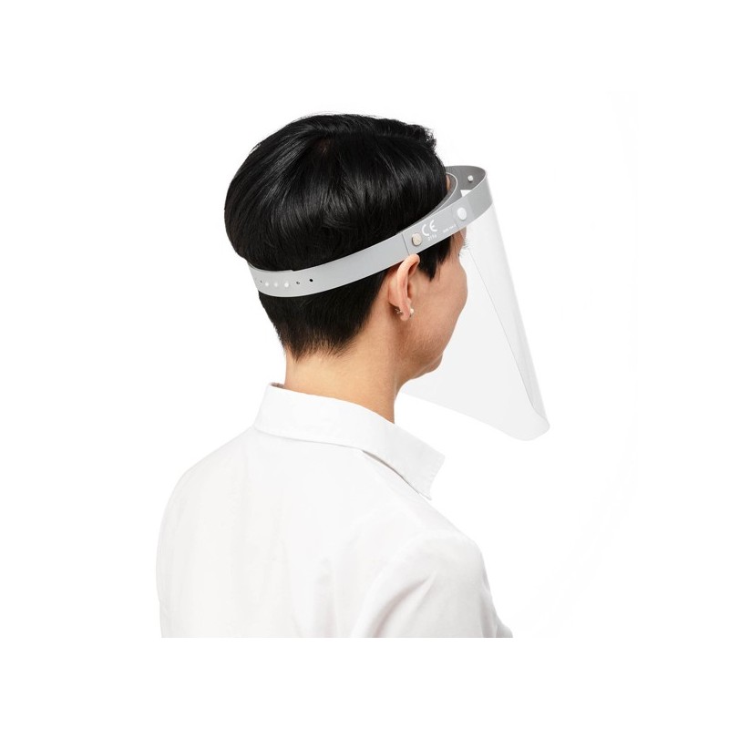 Visiere protettive certificata, realizzata in PPL con pannello frontale in policarbonato. Indicata per proteggere l'utilizzatore di qualunque ambito professionale: medico,commerciale, o privato (Ospedali, supermercati, parrucchieri, estetiste, farmacie, aeroporti, asili, scuole, solo qualche esempio). Resistente al sudore, anti abbagliamento e anti appannamento. Copre perfettamente bocca, naso e occhi. Leggera e confortevole (52gr), non impedisce i movimenti della testa. La visiera può essere sollevata (ad esempio quando si lavora al computer).Si chiude con un bottone a pressione, regolabile (52 / 63 cm) (quindi adatta a oltre il 90% delle persone) e l'archetto imbottito dona un comfort ottimale. Dotata di porta etichetta per l'identificazione della propria visiera. Può essere accuratamente disinfettata, per poter essere riutilizzata più volte.