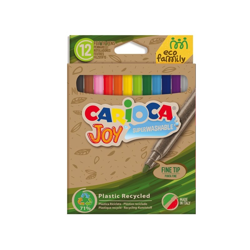La nuova linea Eco Family Carioca® di prodotti realizzati in EcoAllene®, una materia plastica proveniente dal riciclo dei contenitori per bevande e alimenti in poliaccoppiati, utilizzati abitualmente nelle confezioni del latte e succhi di frutta. Il pennarello è prodotto con il 71% di materiale riciclato, dotato di punta fine e inchiostro lavabile dalla pelle e dalla maggior parte dei tessuti con acqua, anche senza sapone.