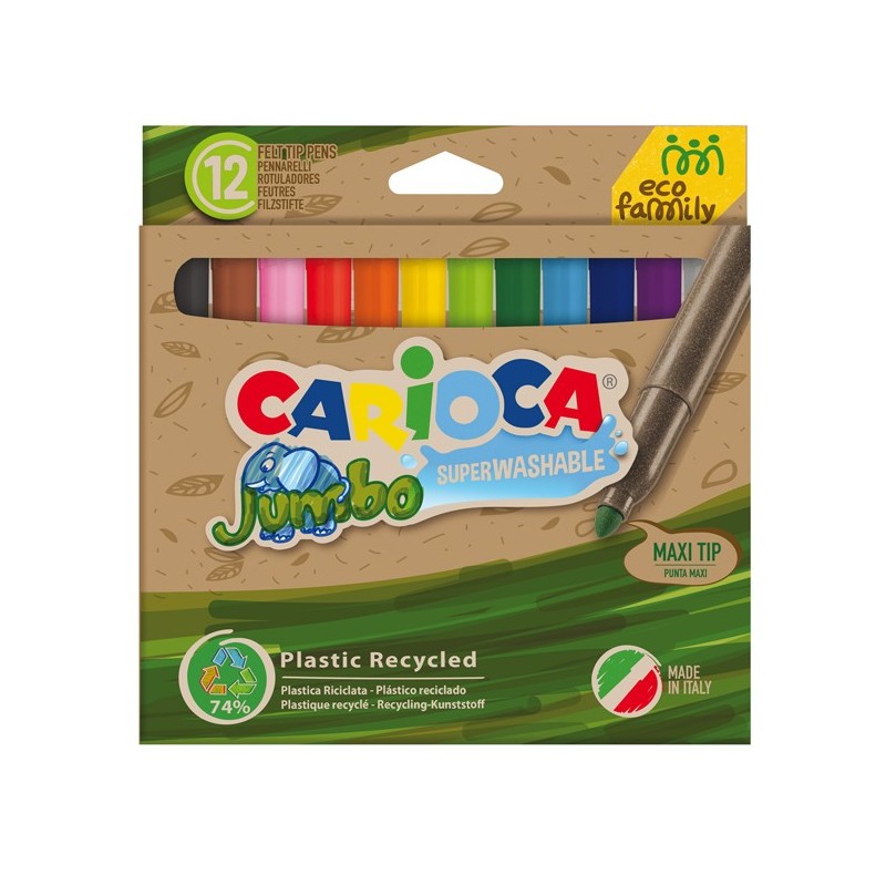 La nuova linea Eco Family Carioca® di prodotti realizzati in EcoAllene®, una materia plastica proveniente dal riciclo dei contenitori per bevande e alimenti in poliaccoppiati, utilizzati abitualmente nelle confezioni del latte e succhi di frutta. Il pennarello è prodotto con il 74% di materiale riciclato, dotato di punta maxi e inchiostro lavabile dalla pelle e dalla maggior parte dei tessuti con acqua, anche senza sapone.